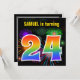Este design de convite de aniversário vibrante e divertido apresenta um padrão de fogos de artifício celebratórios coloridos, inspirado no espetáculo, juntamente com o número "24", que inclui um espectro multicolorido como o arco-íris ou um padrão de gradiente. O nome na frente pode ser personalizado. A parte traseira contém informações personalizáveis sobre a parte. Convites de festas de aniversários como este podem ser enviados para convidar convidados para uma festa de aniversário que se realiza para celebrar o vigésimo quarto aniversário de alguém. [~Z0000337]