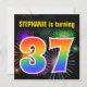 Este design de convite de aniversário vibrante e divertido apresenta um padrão de inspiração para fogos de artifício celebratórios coloridos, juntamente com o número "37", que inclui um espectro de inspiração multicolorido no arco-íris ou um padrão de gradiente. O nome na frente pode ser personalizado. A parte traseira apresenta detalhes personalizáveis sobre a parte. Convites de festas de aniversários como este podem ser enviados a potenciais convidados para uma festa de aniversário que comemora o trigésimo sétimo aniversário de alguém. [~Z0000337]