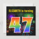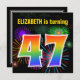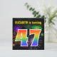 Este design de convite de aniversário vibrante e divertido apresenta um padrão de inspiração para fogos de artifício celebratórios coloridos, juntamente com o número "47", que inclui um espectro de inspiração multicolorido no arco-íris ou um padrão de gradiente. O nome na frente pode ser personalizado. A parte traseira contém informações personalizáveis sobre a parte. Convites de festas de aniversários como este podem ser enviados para convidar convidados para uma festa de aniversário que está a ser realizada para celebrar o 47º aniversário de alguém. [~Z0000337]