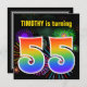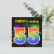 Este design de convite de aniversário vibrante e divertido apresenta um padrão inspirado em fogos de artifício celebratórios coloridos, junto com o número "55", que tem um espectro de inspiração multicolorido no arco-íris ou padrão de gradiente. O nome na frente pode ser personalizado. A parte traseira apresenta detalhes personalizáveis sobre a parte. Convites de festas de aniversários como este podem ser enviados para convidar convidados para uma festa de aniversário que comemora os cinquenta anos de alguém. [~Z0000337]