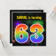 Este design de convite de aniversário vibrante e divertido apresenta um padrão colorido inspirado em fogos de artifício comemorativos que explodem, juntamente com o número "63", tendo um espectro multicolorido como o arco-íris ou um padrão de gradiente. O nome na frente pode ser personalizado. A parte traseira apresenta detalhes personalizáveis sobre a parte. Convites de festas de aniversários como este podem ser enviados a potenciais convidados para uma festa de aniversário que comemora o sexagésimo terceiro aniversário de alguém. [~Z0000337]