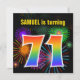 Este design de convite de aniversário vibrante e divertido apresenta um padrão colorido inspirado em fogos de artifício comemorativos que explodem, juntamente com o número "71", tendo um espectro multicolorido como o arco-íris ou um padrão de gradiente. O nome na frente pode ser personalizado. A parte traseira apresenta detalhes personalizáveis sobre a parte. Convites de festas de aniversários como este podem ser enviados a potenciais convidados para uma festa de aniversário que comemora o 71º aniversário de alguém. [~Z0000337]