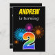 Este design de convite de aniversário vibrante e divertido apresenta um padrão colorido inspirado em fogos de artifício celebratórios, juntamente com o número "2" com um padrão de gradação inspirado no arco-íris multicolorido, num fundo de cor preta. O nome no nome frontal pode ser personalizado. A parte traseira contém informações personalizadas sobre a festa de aniversário. Convites de festas de aniversários como este podem ser usados ao convidar pessoas para uma festa celebrando o segundo aniversário de alguém. [~Z0000325]