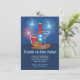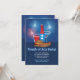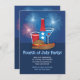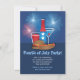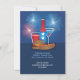 Um convite patriótico com fogos de artifício no fundo. Há comida no primeiro plano com cervejas, álcool e cachorros-quentes. As cores são brancas e azuis vermelhas e perfeitas para um feriado como o quarto de julho, dia memorial e dia de trabalho.