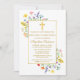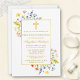 Modern Elegant Watercolor Wildflower First Holy Communion Invitation includes delicate yellow, pink, peach, dusty blue, sage green, purple, red and orange wild flowers, poppies, eucalyptus leaves and other beautiful botanical greenery on a gold frame. Gold Cross.