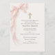 A sweet and elegant First Holy Communion reception invitation featuring a soft pink bow design, perfect for celebrating your daughter special day. The layout keeps the name, date, time, and reception details clear and easy to read while maintaining a delicate, feminine look. Ideal for church celebrations, family gatherings, and formal reception parties. Fully editable text so you can personalize all the details for your event. Beautiful, print ready design.