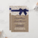 Essa fita rustica de marinho com convites de chá de panela de arco, arromba e rendas fará o anúncio perfeito para qualquer noiva! A design apresenta um adorável fundo de efeito de burlap rustico com uma trim romântica de efeito de renda branca vintage terminada com uma fita marinho impressionante com arco. Esses convites podem ser personalizados para sua ocasião especial e farão o anúncio perfeito para qualquer casamento rústico, chá de panela, festa de noivado, festa de aniversário e muito, muito mais. *Observe que o Zazzle só vende convites impressos para que esses convites não tenham nenhum material real de arromba, rendas, arcos ou fita.