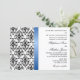 © 2013 Designs socialitas. Nosso convite para casamentos tema damasco preto e branco tem uma fita azul-real falsa. Todos os elementos de design e texto são personalizáveis. Se necessitar de produtos de casamento adicionais, como guardar a data ou o obrigado, os seus cartões com fotos, por favor não hesitem em contactar Designs socialitas. OBSERVE QUE A IMAGEM DE FITA ESTÁ IMPRESSA NO CONVITE.