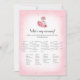 Aproveite jogar este jogo Quem é Minha Mamãe? chá de fraldas em um fundo cor-de-rosa suave com triângulos de ouro bonitos. Uma mamãe flamingo querido bailarina e um bebê no canto inferior esquerdo com flores rosa rosa rosa na cabeça e ao lado dos corpos. Modelos fornecidas atrás.