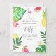 50º convite de aniversário com tipografia manuscrita com folhagem tropical exótica e flores, frutas frescas e um flamingo.
