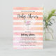Cor-de-água macia, coral de pêssego feminino e fundo de listras brancas, celebrando um chá de fraldas. Flórida, rosa, flamingo com conchas brancas de moluscos por baixo do texto "chá de fraldas".