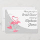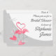 Um par de flamingos cor-de-rosa com pescoço curvado para formar uma forma cardíaca no mar numa praia iluminada pela lua. Um design na moda, romântico com um toque retrô criado em um esquema cor-de-rosa, cinza e branco com um plano de fundo com mudança de cor. Um design personalizável para você personalizar com seu próprio texto, imagens e ideias. Uma imagem de arte digital original.