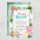 O convite para chás de fraldas bonito apresenta flamingo rosa, elefante para bebês, folhas de palma, melancia sobre fundo azul. Esses convites para chuveiros de bebês são facilmente personalizados para seu evento simplesmente adicionando seus detalhes.