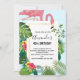 Um convite de aniversário com um flamingo rosa fofo e caprichoso. Cercado por folhas tropicais verdes e flores de hibisco vermelhas. Uma moldura com gradiente dourado quadrada no centro.