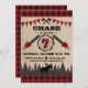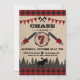 Cheque de flanela vermelha e floresta arborizada com silhueta de alce e toco de madeira, machados e motosserras, impressão de pata de urso, e design de convite para o sétimo aniversário do tema lumberjack do bunting banner.