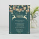 Flocos de neve de ouro elegantes, luzes de cordas e veados em fundo brilhante.