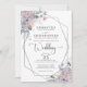 Convite de casamento lindo de primavera ou verão com buquês de flores silvestres boho em aquarela pastel em tons de roxo, violeta, lilás, lavanda, azul poeirento, pêssego, rosa rosado e verde sage e acentuado com tipografia cursiva em carvão cinza e texto e uma moldura geométrica em cinza prateado. Entre em contato com o designer ANTES DE COMPRAR via Zazzle Chat ou makeitaboutyoustore@gmail.com para modificações no design, assistência com personalização ou transferência do design para outro produto ou para itens coordenados.