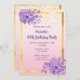 Um cartão de convite feminino e chico para uma festa de aniversário 80 com tema de flor e jardim. Glamoroso com elegante pano de fundo de gradiente rosa dourado e chuva de confete de ouro. Com uma falso estrutura dourada, e flores de cor aquosa ultra violeta e púrpura. Modelo para um nome e detalhes da festa. Letras coloridas violetas em um script de estilo manuscrito. Traseira: pano de fundo rosa dourado e chuva confete e uma flor violeta.