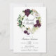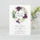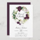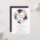 Convites florais elegantes para brunch, de cor floral, com "Brunch & Bubble" rodeados de uma coroa de ameixa escura e de flores brancas, acentuados por folha de ouro falso rosa e folhas verdes. Personalize os convites florais de ameixa adicionando abaixo os detalhes do seu chá. O convite reverte para um fundo sólido e escuro de cor de ameixa. Projetado para coordenar com a nossa coleção de casamento Dark Plum Floral.