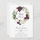 Convites florais elegantes para bebês, com "Chá de fraldas" cercado por uma coroa de ameixa escura e flores brancas de aquarela, acentuados por folha de ouro falso rosa e folhas verdes. Personalize os convites florais de ameixa adicionando abaixo os detalhes do seu chá. O convite reverte para um fundo sólido e escuro de cor de ameixa. Projetado para coordenar com nossa coleção Floral de Plum Escuro.