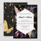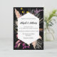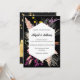 Combinando elegantemente elementos contrastantes, este convite de casamento deslumbrante apresenta um vibrante design floral multicolorido florescendo contra um fundo preto profundo. Enquadrado dentro de uma borda geométrica atemporal, a fonte estilosa do cartão adiciona um toque de sofisticação moderna, prometendo uma celebração memorável de amor e alegria.