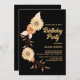 Um convite clássico e elegante de aniversário que inclui uma flor de laranja e folhas castanhas com a tipografia do ouro moderna em fundo preto.