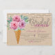 Chá de panela com cone de sorvete cheio de buquê de flores rosadas e folhas verdes e pontos brilhantes cor-de-rosa.