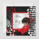 Chá de fraldas Elegante Africano-Americano Vermelho Cute Baby, Vermelho com Brilhos Brancos, Flores Asiáticas de Flor de Cereja com Preto e Branco "É um Menino!"