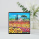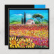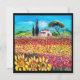 Paisagem da Toscana, beleza vibrante e expressiva do campo italiano e campos de flores coloridos em amarelo brilhante, laranja, rosa, fúcsia, roxo, vermelho, verde, preto, belos prados de Verão, flores, ciprestes e oliveiras, antiga casa de fazenda rústica sob o céu azul. Pintura acrílica sobre tela .