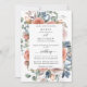 Delicie seus convidados com este convite floral botânico deslumbrante, com um lindo buquê pintado à mão em aquarela em uma mistura delicada de tons de rosa, pêssego, marfim, coral suave, azul poeirento, azul e verde. Seção elegante sobreposta com seus detalhes, envolta em moldura dourada. Elementos de caligrafia moderna. Verso do cartão em tom azul poeirento elegante. Parte da nossa coleção de Casamentos e eventos "Florais Felizes".