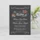 Convites florais do casamento do conselho de giz do vintage - o buquê pintado mão encantador do país de rosas abstratos, de margaridas e de flores selvagens lunáticas cria uma grinalda floral bonita com clássico e a caligrafia à moda do roteiro do estilo do vintage no fundo do quadro-negro faz um convite preto e branco atraente do casamento com um respingo da cor. Adicione seus nomes e informação wedding neste modelo fácil de usar. A tipografia retro misturada elegante do estilo do giz e da tipografia com roteiro extravagante do swash é apropriada para o tema formal ou semi-formal. Aperfeiçoe para casamentos modernos na moda do país com um toque elegante mas ocasional de encanto do sul romântico sofisticado para casais tradicionais. Termine o pacote do casamento, os jogos de acessórios nupciais dos grupos dos artigos de papelaria, do porte postal e do enviamento disponíveis em cima do pedido. Contacte-nos por favor para a ajuda com personalização se você precisa a sala adicional para seus detalhes do casamento.