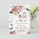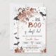 Celebre o Halloween usando nosso Floral A Little Boo Chá de fraldas Invitation! Perfeito para uma chá de fraldas de Dia das Bruxas, este adorável convite apresenta uma mistura divertida de florais cor-de-rosa e morcegos assustadores ao redor de um arco de na moda. As flores suaves e femininas contrastam lindamente com os elementos do Dia das Bruxas, como morcegos e teias, criando um design único que combina fofo e estranho em perfeita harmonia. BBS768