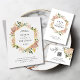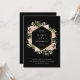 Esses incríveis convites para o casamento apresentam uma falso estrutura geométrica dourada cercada por flores leves, neutras em aquarela, cores de tons de terra como pêssego bege, rosa empoeirado e verde macio com acentos e folhas de ouro. Um elegante olhar floral de vassoura sobre um fundo preto escuro.