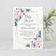 Estes convites para chuveiros de bebês apresentam um design floral de aquarela com flores cor-de-rosa azuis e pinceladas, folhagem de eucalipto e uma falso estrutura geométrica de ouro. Personalize o texto do convite com o seu próprio texto. Itens correspondentes também disponíveis. Por favor, visite nossa loja.