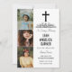 Convite funerário em branco com uma cruz negra, flores e fontes elegantes personalizadas com três fotos. Convite para o funeral de fotos em branco e preto com uma cruz.