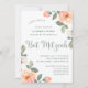 Este adorável convite do Bat Mitzvah apresenta cor de pêssego e flores brancas, com muitas folhas verdes, e tipografia moderna com um fundo branco limpo.