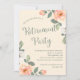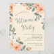 Este adorável convite de festas de aposentadoria apresenta um fundo de pêssego macio com bolinhas brancas sutis, e pêssego e flores brancas em moda com muitas folhas verdes.