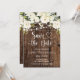Anuncie seu dia especial com uma elegância atemporal usando este lindo cartão de casamento Save the Date com flores brancas rústicas! Com rosas brancas exuberantes e buquê de flores, folhagem verde fresca, luzes delicadas e bela escrita em coração sobre um fundo rico e quente de madeira escura. Um design clássico e refinado perfeito para casamentos de jardim na primavera e no verão, cerimônias rústicas em celeiros e qualquer celebração romântica onde flores brancas limpas são as estrelas!