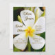 Um casamento é o início de "novos começos". A Plumeria, ou também conhecida como Frangipani, é o símbolo havaiano de "positividade" e "novos começos". Um convite de casamento único com uma fotografia de perto de uma flor branca de Plumeria com folhas tropicais e botões atrás dela. No Havaí, essa flor é usada para colares de lei fazer por causa de sua forma e perfume doce.