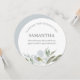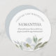 A Elegante ponte botânica de cor d'água ou placa de madrinha de casamento em um formato redondo único enquadra seus detalhes com uma borda de folhas de cor d'água e florais em tons legal e claros de cinza e verde. A fonte é definida em um tipo elegante de sans tradicional serif e script. Perfeito para primavera, verão, outono do outono, casamentos temáticos rústicos ou jardins. Para ver mais designs como este, visite o VG Invites em www.zazzle.com/vginvites