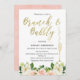 Floral Brunch Bubbles Chá de panela Brunch e chá de panela espumante com um arranjo floral, na sua maioria branco e rosa, na base e na rubrica de caligrafia em folha de ouro e vidro de champanhe. A parte de trás do convite é uma imagem de lavagem a aquarela cor-de-rosa. Uma maneira doce de convidar convidados para um chá de panela.