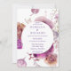 Apresentada aqui é uma peça de arte feita de aquarela pintada manualmente, esta design apresenta flores roxas lindamente trabalhadas. O fundo é branco, o centro tem um espaço circular para personalizar suas informações. A fonte é uma cor púrpura macia. No verso está um gráfico floral roxo. Personalize seu convite de casamento hoje!