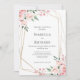 Convite de casamento personalizável em branco limpo. Possui buquês florais bonito em tons cor-de-rosa e cor-de-rosa pálido, com uma estrutura geométrica de ouro moderna.