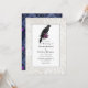 Convite de casamento gótico preto e roxo com um corvo decorado com rosas e um fundo de renda com cor damasco rosa.