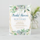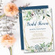 Flores de cor aquosa, cor-de-rosa e branco, de cor azul-claro, dentro de uma estrutura dupla geométrica dourada apresentam floreios botânicos e de bagas e a parte de trás da carta tem uma bela e rica cor azul-escura. Personalize este chá de panela com suas próprias cores e fontes ou mantenha esta tipografia popular como é para sua conveniência.