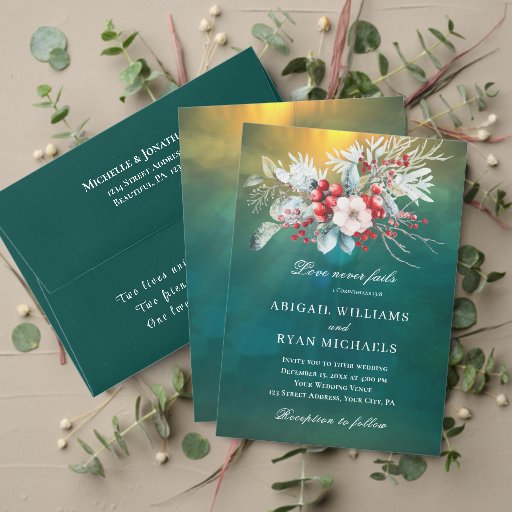 Escritura inspiradora cristã, o convite moderno para o casamento retrata um inverno elegante, o Natal floral com a beleza da fruta vermelha congelada, uma flor branca e delicadas folhas verdes e suaves e vergreens num fundo verde escuro e dourado. Apresenta Bíblia Verse 1 Corinthians 13:8, "O amor nunca falha." Se há algo que você não vê ou se você quer mudar, por favor, entre em contato comigo com o botão de bate-papo na página Zazzle.
