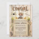 A palavra "cowgirl", que tem luzes marqueadas e couro falso castanho e enferrujado, aparece acima de uma adorável pintura aquosa de uma pequena cowgirl vestindo um chapéu de cowboy Stetson de tamanho excessivo e dungarees de denim. Ela está sentada contra um fundo de madeira angustiado e tem girassóis de ambos os lados. A letra inspiracional aparece em volta dela na máquina de escrever; fontes cursivas e ousadas dando ao convite uma aparência de página de rascunho. São ideais para um chá de fraldas ou festa do tema ocidental rústico.
