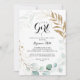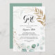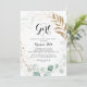 Este floral de ouro rústico é um convite para chás de fraldas de menina é perfeito para um simples chá de fraldas ou borrifo. Este design artístico apresenta folhagem verde de ouro, feita à mão, floral e aquarela, eucalipto, belamente organizada numa elegante moldura geométrica.
