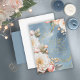 Esta suíte de casamento com seus florais exuberantes e dramáticos de branco cremoso a rosa pincelado, sotaques dourados e belos e poeirentos fundos azuis, cria uma vibração elegante e romântica, dando apenas uma dica do que os convidados podem esperar no seu grande dia. Este convite de casamento impressionante sobre um fundo de azul empoeirado fornece uma modelo para adicionar facilmente seus detalhes de evento em texto de ouro luxuoso. Procure ID1022 para ver todos os produtos nesta suíte de casamento.