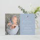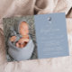 Este elegante convite batismo apresenta um buquê de aquarela de flores azuis e marinhos poeirentas e folhagem prateada em uma cruz de folha de papel prateada, acima das palavras "por favor junte-se a nós para o batismo do nosso filho" em elegante caligrafia branca e itálico em um fundo azul poeirento. Personalize-o com o nome no script branco e os detalhes na fonte sans serif. Adicione facilmente uma foto vertical do seu filho ao lado esquerdo do convite. A parte traseira da placa é azul empoeirado sólido.